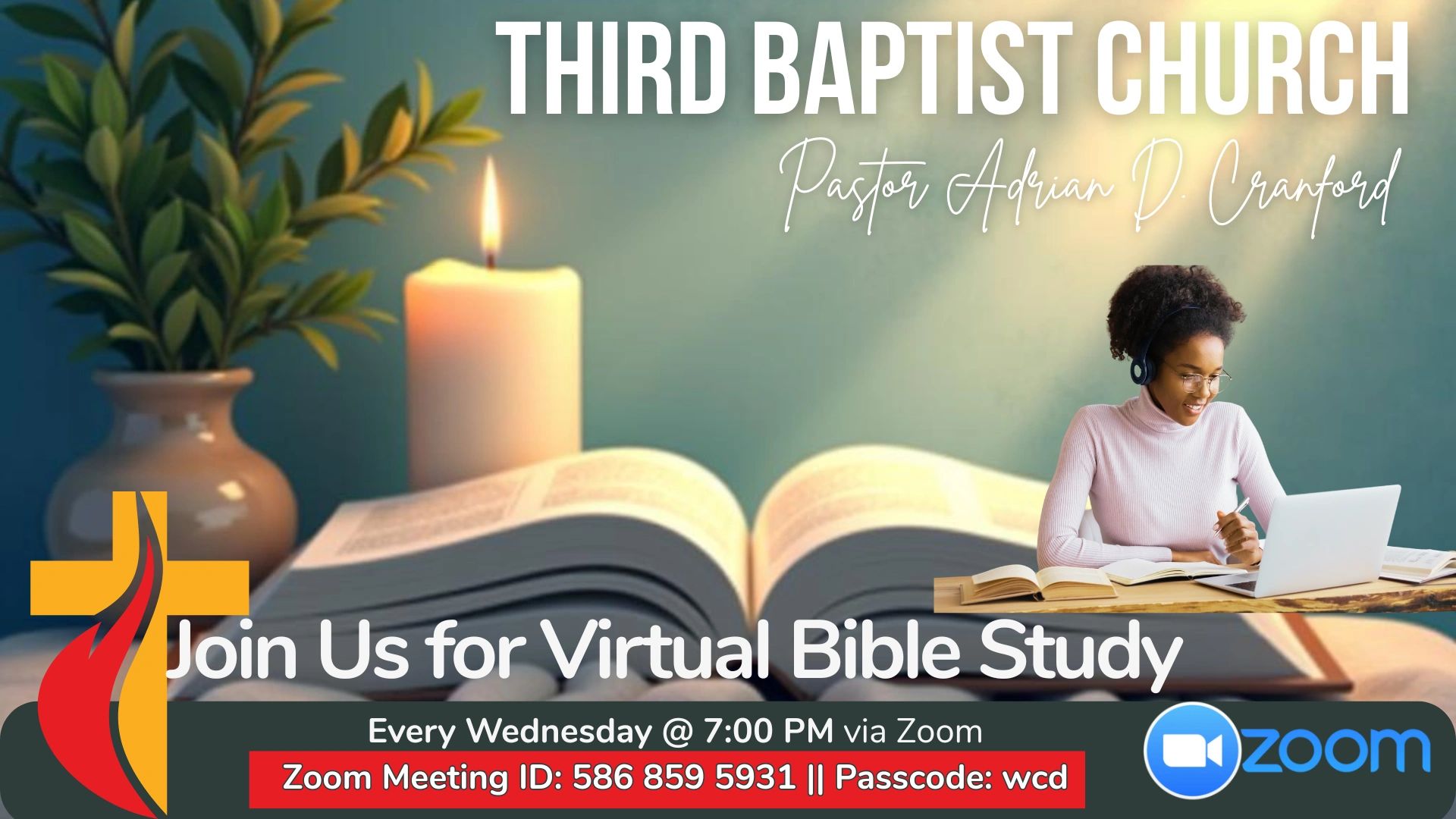 Join Third Baptist Church on Wednesdays at 7:00pm for Bible Study via Zoom for a “30-Minute Spirit Lift” | Zoom ID: 586 859 5931 | Passcode: wcd